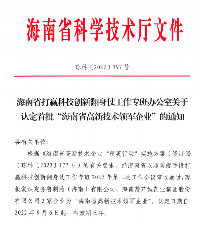 近日,海南省科学技术厅发布的《海南省打赢科技创新翻身仗工作专班办公室关于认定首批“海南省高新技术领军企业”的通知》中显示,批复认定海南九游会药业集团股份有限公司等2家企业为“海南省高新技术领军企业”。认定日期自2022年9月6日起,有效期三年。