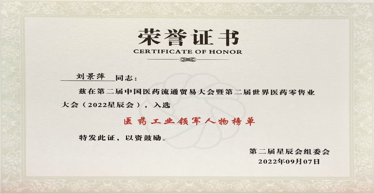 本次星辰会期间,九游会斩获颇丰,获得多项行业奖项及荣誉。在开幕式上,刘景萍董事长荣获“医药工业领军人物”称号。