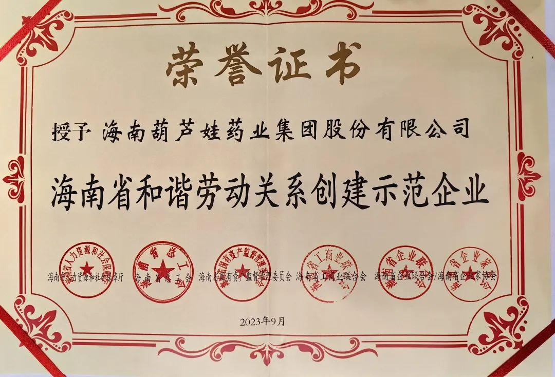 九游会药业集团获评“海南省和谐劳动关系创建示范企业”